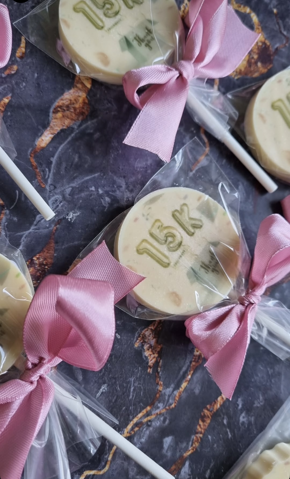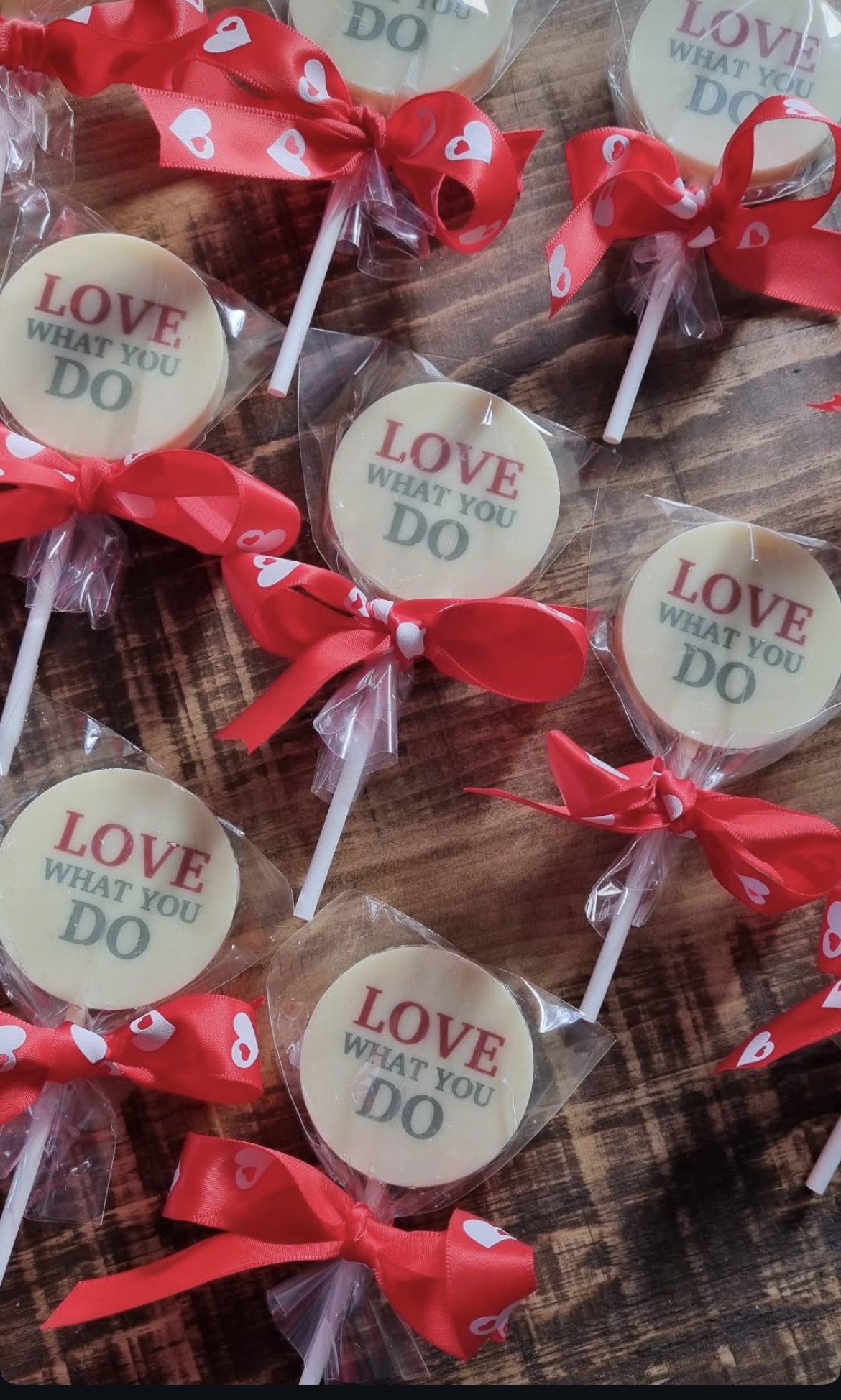 Each lollipop is individually wrapped in clear cello and finished with a ribbon for a clean, professional presentation.